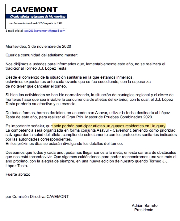Transmitimos la comunicación recibida de parte de ASAVUR, referente a la cancelación del ya tradicional torneo internacional JJ Lopez Testa, cuya fecha propuesta era 11 y 12 de diciembre del 2020